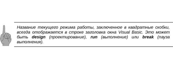 Заголовок окна (Window Header) отображает название редактируемого проекта и текущий режим работы Visual Basic, как об этом говорилось выше.
