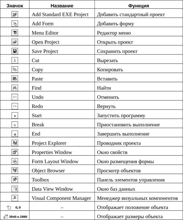 Прямо под строкой меню, как у многих приложений Windows, находится панель инструментов (Tool Bar), кнопки которой дублируют наиболее часто используемые пункты меню Visual Basic. На панели инструментов, также, отображается справочная информация о положении и размерах выделенного объекта, либо расположении курсора в тексте программы (Рис.2.6).