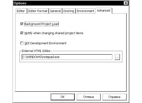 Если требуется установить другой тип интерфейса, выберите команду меню Tools Options (Инструменты Параметры). Появится диалог Options (Параметры), где нужно перейти на вкладку Advanced (Дополнительно) (Рис.2.11).
