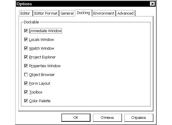 Установка флажка слева от названия соответствующего подчиненного окна включает режим прикрепления к краю главного окна Visual Basic, а сброс флажка выключает его.