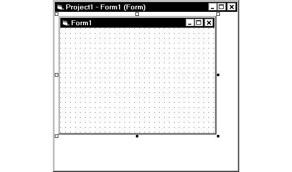 Кроме объектов интерфейса среды программирования Visual Basic, примерно посередине экрана (Рис.2.4) располагается окно созданного проекта, имеющее заголовок Project1 Form1 (Form) (Project1 Form1 (Форма)), внутри которого находится отображаемая форма будущего приложения (Рис.2.13).