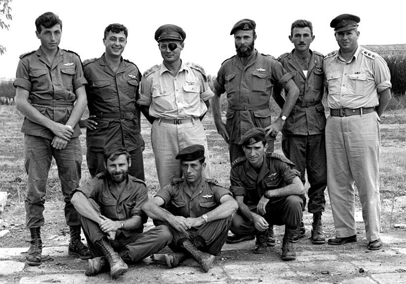 Меир Хар Цион, капитан, Герой Израиля, стоит первый слева. Арик Шарон, генерал, стоит второй слева. Моше Даян, генерал, стоит третий слева.