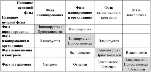 Фазы управления проектом реализуются последовательно и итерационно повторяются при переходе от одной фазы реализации проекта к другой. Прохождение всех фаз управления проектом на одной фазе реализации проекта образует цикл управления фазой реализации проекта. В зависимости от текущей фазы управления проектом выполняется определенный набор операций управления по каждой предметной области управления. В случае возникновения изменений ключевых показателей проекта возможен возврат на одну из предыдущих фаз управления проектом. При изменении фазы управления проектом изменяется состояние проекта (характеристика степени завершенности проекта). Возможные варианты изменения состояний проекта представлены в Табл. 1.1.