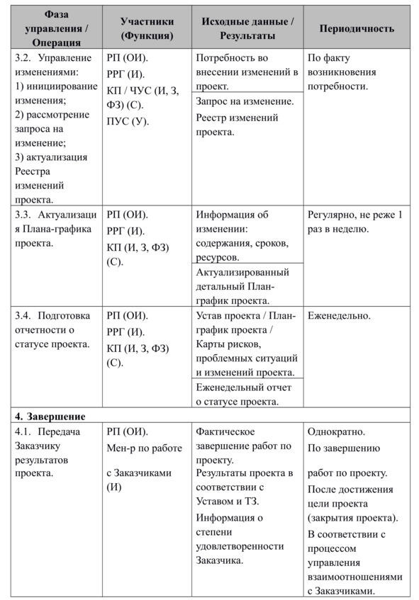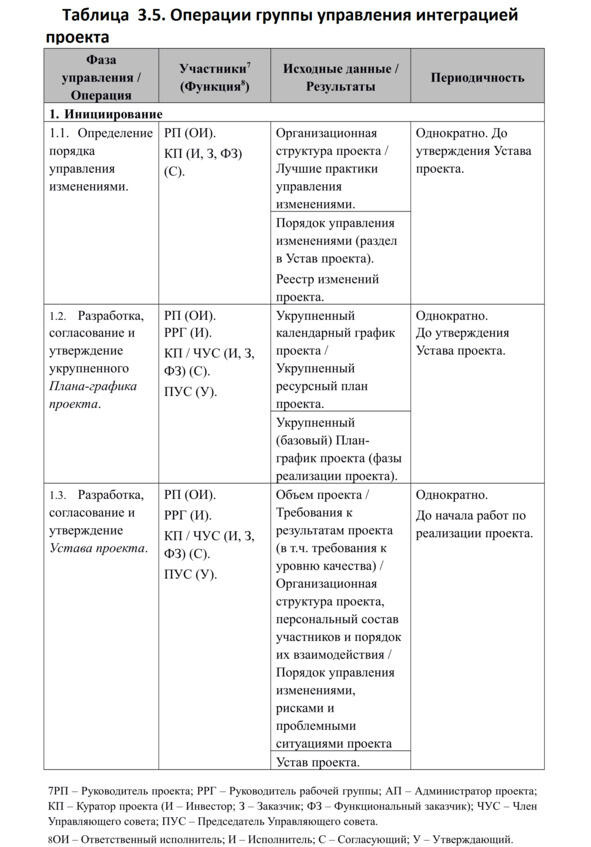 Описание основных операций группы управления интеграцией проекта (сгруппированные по фазам управления) приводится в Табл. 3.5.