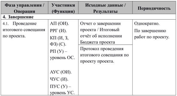 По факту завершения проекта Руководитель проекта формирует Отчет о завершении проекта (см. Приложение 13.). Отчет о завершении проекта проектный документ, содержащий итоговую информацию о результатах проекта. В состав Отчета должна быть включена следующая информация: Общие сведения о проекте (название, данные об основных заинтересованных лицах и команде управления проектом); плановые и фактические сроки реализации; отклонения по ключевым показателям проекта по фазам (плановые/фактические значения показателей, отклонение в абсолютных и относительных величинах, причины отклонений); отчет о разработке проектной документации (наименование, плановые/фактические сроки завершения разработки, причины задержек и предпринятые действия по их устранению); перечень основных проблемных ситуаций (название и краткое описание, причины возникновения (перечень реализовавшихся рисков, которые привели к появлению проблемы), предпринятые действия по устранению); перечень рисков проекта (название и краткое описание, уровень, стратегия реагирования, перечень действий до/после возникновения, ответственный за выявление, ответственный за реагирование, результат управления риском). Согласование и утверждение Отчета осуществляется в соответствии с установленными в проекте правилами коммуникаций (см. п. 3.5.). Как правило, Отчет готовится Руководителем проекта к итоговому совещанию по проекту.