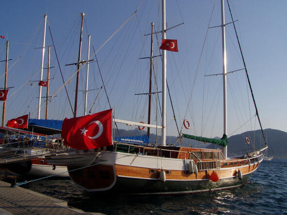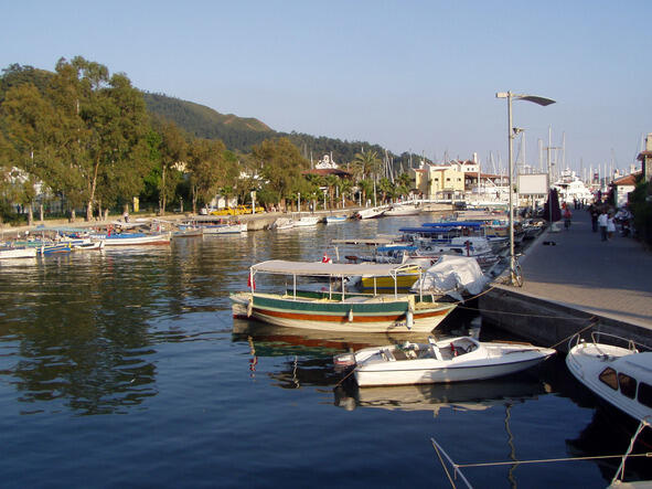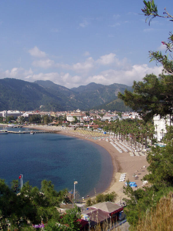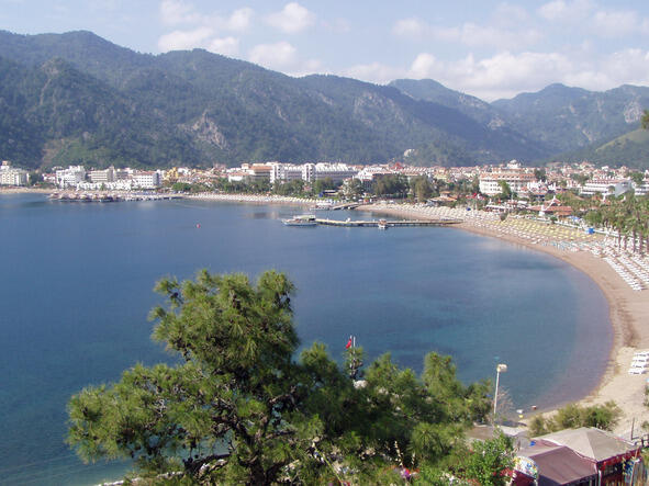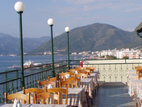 Небольшой отель Ojactan расположен на самом берегу мармарисской бухты. Каждое утро мы завтракали и наслаждались великолепным видом на море. Как нам рассказывали местные жители, на дне бухты бьют ключи, поэтому даже в самую жару море слегка прохладное. Свежий ветерок доносит шум моря и крики чаек, где-то вдалеке, у самого горизонта на волнах лениво покачиваются яхты. Ни с чем не сравнить это ощущение покоя и безмятежности, когда вы смотрите на город и окрестности с высоты птичьего полета (ресторанчик отеля располагался на крыше). С интересом рассматриваю горы, сплошь поросшие лесом, издалека они кажутся бархатными. Узкие тропинки взлетают вверх к самой вершине, взглядом прослеживаю их стремительный бег. Набережная совершенно пустынна в этот ранний час. Ровные ряды зонтиков и шезлонгов напоминают игрушечный городок, и только служители разгребают влажный песок граблями, убирая водоросли и готовясь к началу нового дня.