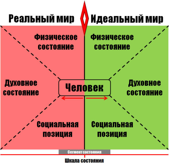 Человека как такового, то есть вне контекста его взаимодействия с окружающим миром, мы будем называть личностью. Далее возникает вопрос о том, какое же положение занимает личность по отношению к реальному и идеальному мирам? На представленной выше схеме мы видим, что человек одновременно проживает свою жизнь в двух мирах. Он как бы находится на границе, разделяющей реальный и идеальный миры. Если человек находится ровно посередине, то реальный и идеальный миры занимают в его существовании одинаковую долю и значимость. Но так бывает лишь в очень редких случаях. Обычно в жизни каждого человека один из миров занимает большую часть, а другой меньшую. В разные периоды жизни личность смещается в ту или иную сторону. Существуют определённые границы, которые ограничивают личность в перемещении между мирами. Однако, эти границы могут расширяться или сужаться. Пространство, в пределах которого личность может смещаться в ту или иную сторону, называется сегментом состояния. В свою очередь, сегмент состояния располагается на шкале состояния. Шкала состояния это условный диапазон, ограничивающий пределы реального и идеального миров и отражающий возможный потенциал смещения или расширения сегмента состояния (см. рисунок 1).