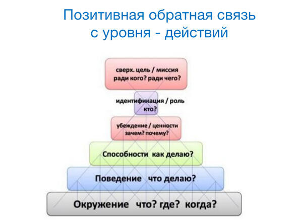 Вопрос «Что ты теперь будешь делать по-другому?» позволяет ребенку создать новую позитивную модель (картину), которая поможет ему справиться с этой ситуацией в следующий раз. Также важно учитывать, что позитивная обратная связь идет только с уровня действий, а не с уровня идентичности (рис. 4). Мы не создаем идентичность «отличник» или «хорошист», или «троечник». Важно, чтобы обратная связь шла только с уровня действий: «Ты получил тройку. Чему тебя эта история научила? Что ты теперь будешь делать по-другому?» И при этом с уровня идентичности мы осознаем, что с ребенком все в порядке, что у него есть все ресурсы и в каждый момент времени принимает наилучшие решения, что изменения неизбежны и он способен к хорошим оценкам.