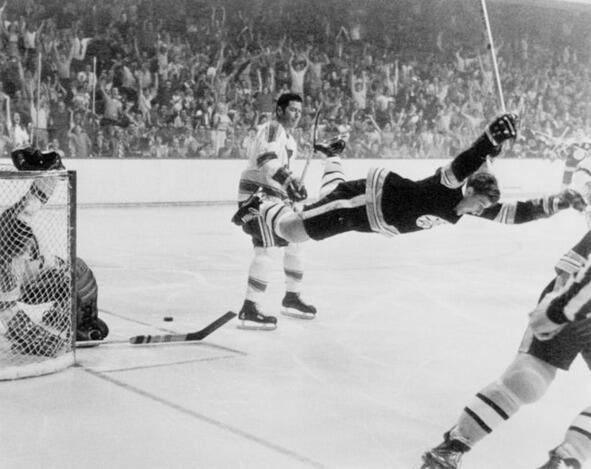 «Летающий» Бобби Орр забрасывает шайбу в ворота S.L. Blues. В воротах Гленн Холл. Самая легендарная шайба за всю историю розыгрыша Кубка Лорда Стэнли!