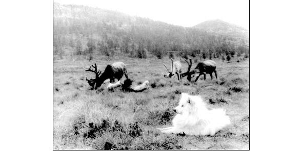 Верховые олени (видно сёдла) оставлены на попечение ненецкой лайки Чайки (чистобелая). Верховья р. Омолон. 1969 г. (В бригаде до 10 оленегонок разных окрасов). Фото Л. Семёнова из архива авторов