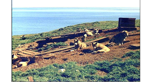 Жильё стаи (упряжки)чукотских лаек. Пос. Лорино. 1990 г. Фото Б. Широкого