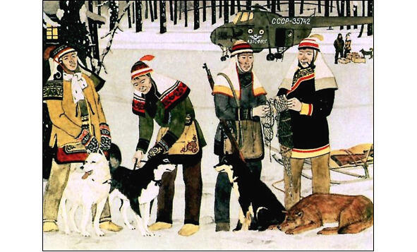 Таким образом, все породы аборигенных и местных лаек правильно было бы разделить на 3 группы. Получится классификация, где группа пород выделяется по признаку обитания собак и их владельцев в пределах того или иного географического ландшафта. А породы группы по принадлежности к этническому сообществу. Но если уж не выходит привязка к конкретному народу, приходится давать породе географическое название. Как в случае с амурскими лайками, которых достаточно точно изобразил наш знакомый дальневосточный художник и краевед Геннадий Павлишин. А ведь отцы и деды этих охотников имели своих лаек, нанайских, удэгейских
