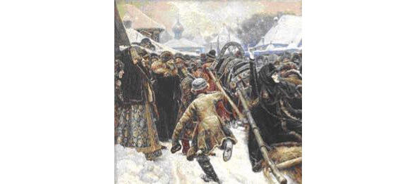 Однако, начнем по порядку. Впервые о этой церкви мы читаем в делах патриарших приказов от 1625 года, там она называется «Николой под вязками», видимо так прозвали его жители из-за вязов, окружавших храм. Сам он был деревянным. Однако его купол хорошо выделялся над низкими домишками тогдашнего пригорода Москвы, не зря Суриков изобразил эту церковь на своем полотне «Боярыня Морозова». События картины происходят в ноябре 1671 года и левее поднявшей двуперстие «расколоучительницы» Феодосии Морозовой хорошо видно здание храма.