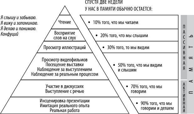 Итак, все обучение Дейл предлагает разделить на пассивное и активное. Чтение возглавляет пассивное обучение и дает спустя две недели лишь 10 % эффекта от изученного. Далее идет то, что мы слышим, видим, и эта информация эффективна на 50 %. Вспомните свои впечатления от монотонной лекции и сравните их с впечатлением, если бы этот же самый материал вам представили в виде яркой презентации или наблюдения за реальным опытом.