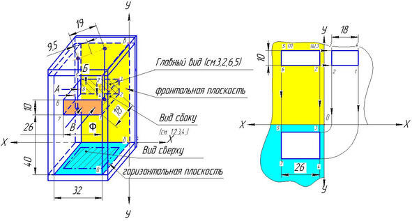 Здесь (на фото, Рис.1.) видим, что перед нами согнутая из подручного матермала (в данном случае из картона) коробка прямоугольной формы. Внутри коробки подвешена ДЕТАЛЬ (в данном случае спичечный коробок) на двух нитях. Почему на двух нитях? Да потому, что две нити «ОБЕЗДВИ-ЖАТ» деталь от вращения вокруг вертикальной оси. Они так же не дадут ЕЙ смещаться в каких-либо других напрапвлениях. Важно, деталь, любой фор-мы, всегда устанавливать так, как это сделали мы со спичечным коробком. Мы грани детали (коробка) расположили (и затем «Обездвижили») так, чтобы они были параллельны всем плоскостям, на которые они будут проектироваться. Заметим здесь, что при проектировании в основном ЗАДЕЙСТВУЮТ три плоскости: фронтальную плоскость, она на фото, располагается параллельнопроему (т. е. открытой стороне коробки) и находится за ним, т. е. это задняя стенка коробки. На Рис.2.. она окрашена в желтый цвет. Далее при проектировании используется ГОРИЗОНТАЛЬНАЯ плоскость, на Рис.2., она окрашена в голубой цвет. Ну и наконец последняя ПРОЕКЦИОННАЯ плоскость боковая, на которой вычерчивается ВИД СБОКУ. На Рис.2., она осталась не окрашенной. Это правая боковая стенка коробки (см. Рис.1.) И это пока все пояснения к рисункам 1 и 2.
