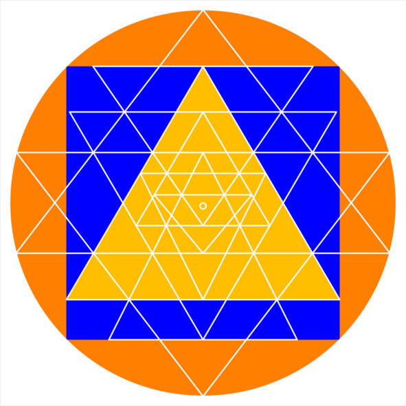 Рис. 2. Шри Янтра. Схема построения центрального ядра по алгоритму 1 на базе квадрата и вписанного в него треугольника