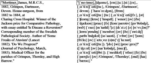 «Mortimer, James, M.R.C.S., 1882, Grimpen, Dartmoor, Devon. House-surgeon, from 1882 to 1884, at Charing Cross Hospital. Winner of the Jackson prize for Comparative Pathology, with essay entitled «Is Disease a Reversion?» Corresponding member of the Swedish Pathological Society. Author of «Some Freaks of Atavism (Lancet 1882). «Do We Progress?» (Journal of Psychology, March, 1883). Medical Officer for the parishes of Grimpen, Thorsley, and High Barrow.»