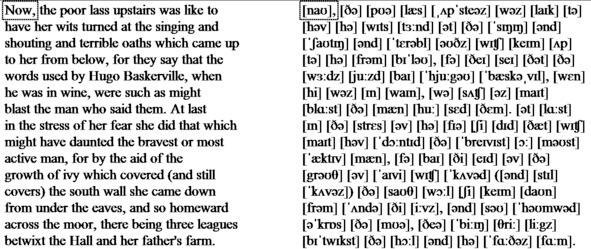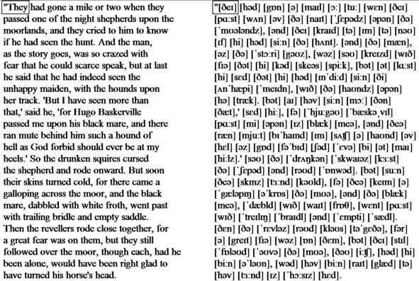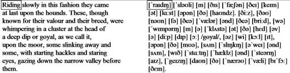 «They had gone a mile or two when they passed one of the night shepherds upon the moorlands, and they cried to him to know if he had seen the hunt. And the man, as the story goes, was so crazed with fear that he could scarce speak, but at last he said that he had indeed seen the unhappy maiden, with the hounds upon her track. But I have seen more than that, said he, for Hugo Baskerville passed me upon his black mare, and there ran mute behind him such a hound of hell as God forbid should ever be at my heels.» So the drunken squires cursed the shepherd and rode onward. But soon their skins turned cold, for there came a galloping across the moor, and the black mare, dabbled with white froth, went past with trailing bridle and empty saddle. Then the revellers rode close together, for a great fear was on them, but they still followed over the moor, though each, had he been alone, would have been right glad to have turned his horses head.