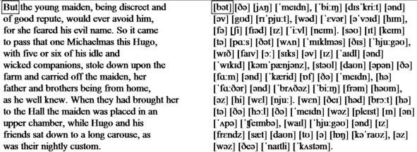 But the young maiden, being discreet and of good repute, would ever avoid him, for she feared his evil name. So it came to pass that one Michaelmas this Hugo, with five or six of his idle and wicked companions, stole down upon the farm and carried off the maiden, her father and brothers being from home, as he well knew. When they had brought her to the Hall the maiden was placed in an upper chamber, while Hugo and his friends sat down to a long carouse, as was their nightly custom.