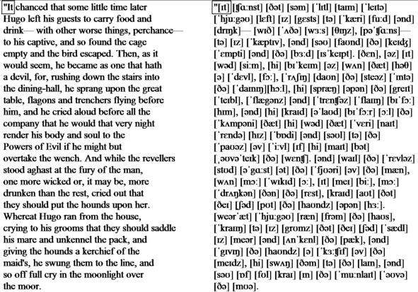 «It chanced that some little time later Hugo left his guests to carry food and drink with other worse things, perchance to his captive, and so found the cage empty and the bird escaped. Then, as it would seem, he became as one that hath a devil, for, rushing down the stairs into the dining-hall, he sprang upon the great table, flagons and trenchers flying before him, and he cried aloud before all the company that he would that very night render his body and soul to the Powers of Evil if he might but overtake the wench. And while the revellers stood aghast at the fury of the man, one more wicked or, it may be, more drunken than the rest, cried out that they should put the hounds upon her. Whereat Hugo ran from the house, crying to his grooms that they should saddle his mare and unkennel the pack, and giving the hounds a kerchief of the maids, he swung them to the line, and so off full cry in the moonlight over the moor.