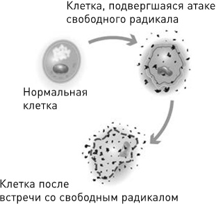 Свободные радикалы вступают в реакцию с другими молекулами, в результате происходит окисление, целью которого является нейтрализация нестабильного электрического заряда. Окисление это, по сути, «биологическая коррозия». Оно создает эффект снежного кома, т. е. молекулы крадут друг у друга электроны, становясь в ходе кровавой биологической борьбы новыми свободными радикалами. Быстро растущее количество свободных радикалов приводит к разрушению как самой клетки, так и митохондриальных мембран. Такой процесс называется перекисным окислением липидов. Он вызывает хрупкость мембран и их распад.