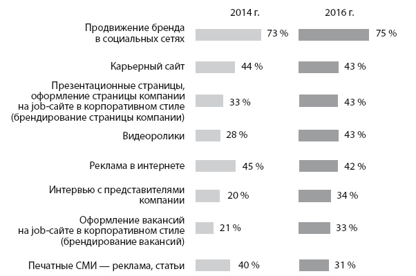 Что касается ключевых каналов и форматов продвижения бренда работодателя, на российском рынке не произошло существенных изменений в их выборе за последние два года. Единственное компании гораздо чаще стали использовать видеоролики. Во-первых, для этого появились все технические возможности (на любом устройстве сейчас можно быстро посмотреть любой ролик, не дожидаясь долгой загрузки, как раньше). Во-вторых, представители новых поколений, с которыми сейчас активно общаются работодатели, предпочитают видео фотографиям с подписями и тем более длинному тексту.