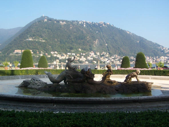 В комплексе фонтана, в бассейне круглой формы, размещены скульптуры мальчиков-амуров, дельфина и дракона. От главного фасада виллы Olmo открывается красивый вид на всю прибрежную часть города Como и в другие стороны на живописные побережья и гору Брунате с маяком и фуникулёром.