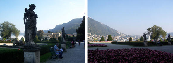 Перед виллой Ольмо разбит фонтан со сложной скульптурной композицией. До набережной озера протянулся обширный парк, гармонично украшенный статуями античных богов на фоне цветочных клумб, ровно подстриженных кустарников и раскидистых деревьев.