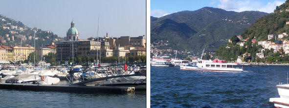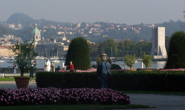 На cледующем фото панорама центра города Комо. Слева в кадре круглый купол собора Duomo di Como, а справа на берегу озера высится городской Мемориал. Видно, что над городом стоит атмосферная дымка после дождя.