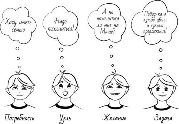 У меня может быть потребность иметь семью. Потребность общая и универсальная. Тогда я смогу сформулировать цель «пожениться». Цель всегда абстрактная. Определив потребность и цель, я могу еще больше конкретизировать. Так я формулирую желание «иметь семью с Машей». В желании больше конкретики. Я понимаю, что я не просто хочу жениться, а на ком-то определенном. И когда я понял, чего хочу, время формулировать задачу. Ей может быть «купить букет, кольцо и пойти к Маше с предложением».