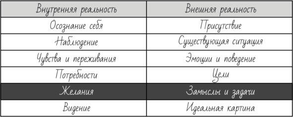 Строку, отображающую внешний мир, я назвал «замыслы и задачи». Они проистекают из целей. Чтобы реализовать цель, нужно разбить путь к ней на конкретные задачи.
