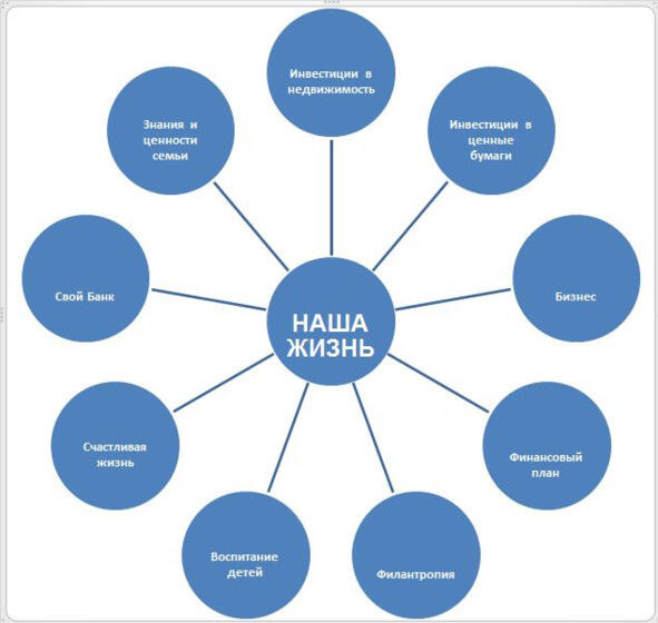 Мы видим разные составляющие жизни человека. Каждый аспект важен. Каждый из них, в свою очередь, делится на свои составляющие. Правильное развитие всех элементов нашей жизни и является задачей Семейного Офиса.