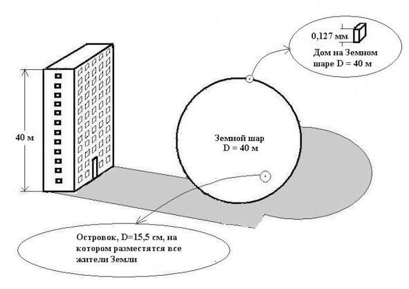 Ну, а если всё население Земли собрать вместе, эту задачку, помнится, уже решил Антуан де Сент-Экзюпери, собрать на островке, выделив каждому из семи с половиной миллиардов площадь по четверти квадратного метра, то каких же размеров будет сей остров на шарике диаметром в 40 метров? Оказывается, размером он будет менее 16-и сантиметров! Его даже на картах не отметишь!