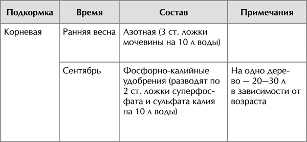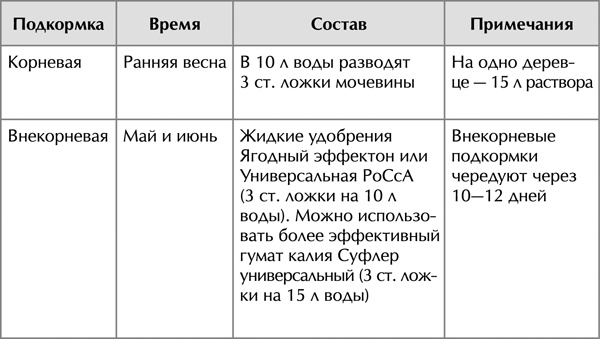 Подкормка молодых деревьев первого года посадки и последующих до начала плодоношения имеет свои особенности (см. табл.).