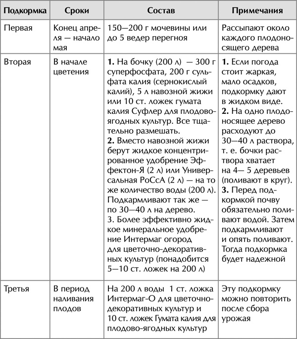 Плодоносящие яблони подкармливают 34 раза за сезон (см. табл.).