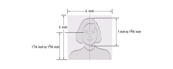 На фотографии должна быть видна вся голова, начиная с верхней части, включая волосы, до нижнего края подбородка. Высота головы должна составлять 2535 мм (1-1-3/8 дюймов) или занимать 50%-70% фотографии: