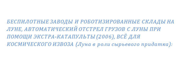Как только лунная индустрия заработала на полную мощность, освоила выпуск качественного топлива и различных «аксессуаров», к примеру топливных баков, так у перевозчиков в Космосе появилась возможность заправляться на околоземной орбите легко и быстро, как автомобилям на АЗС. Космические корабли либо заправляли, либо меняли им топливные баки пустые на полные (отстёгивали пустые и пристёгивали полные). Хотя замена бака технически более сложная процедура, чем заправка В результате ЖРД стали использоваться даже мелкими частными фирмами, особенно часто на межпланетных трассах В Космосе с той поры заправляться стало выгоднее, чем на Земле, это стали делать для многих видов транспортных космических кораблей, даже для спутников. Тяжёлые межорбитальные комплексы пилотируемые и грузовые, межорбитальные буксиры, космические станции, крупные геостационары последние выглядели как станции, по размерам, с той лишь разницей, что функционирование геостационарных спутников обеспечивается за счёт команд операторов с Земли, без участия людей на орбите, заправляли всех! Таким образом Земля постепенно избавилась от роли сырьевого придатка космической транспортной индустрии, передав эту, весьма важную, стоит отметить, роль Луне! Наконец, когда ЖРД стали устаревать, их стали вытеснять из обихода, поставки с Луны в это время не прекратились, так как на Луне производились не менее ценные компоненты сырья кислород, вода, минералы и стройматериалы, практически целиком изготавливаемые на Луне Благодаря экстра-катапультам доставка грузов с Луны была по-прежнему выгоднее, чем доставка тех же грузов с Земли, когда приходилось преодолевать обязательно силу земного притяжения, проходить сквозь толщу атмосферы напролом Лунные экстра-катапульты дошли практически до идеального совершенства тогда: они стали компоновать и отстреливать грузы автоматически!