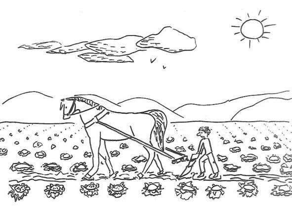 Дед отпустил собачку на травку, поправил ошейник, и продолжил: «Понял, что на велосипед мне не заработать. Попросил деда устроить меня на хорошую работу, окучивать на лошади грядки. Выбрал он мне смирного коня по имени Головко, которого поставишь в борозду, скажешь Нооо! Милый!, и он идет, а я за ним, держу плужок».