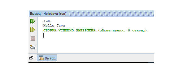 Запустите программу на выполнение, нажав значок зеленого треугольника или выбрав пункт меню Выполнить | Запустить проект. Спустя несколько секунд сборка проекта будет завершена. В нижней части интерфейса NetBeans откроется окно терминала, в который будет выведен текст «Hello Java» и сообщение об успешной сборке проекта (рис. 2.4).