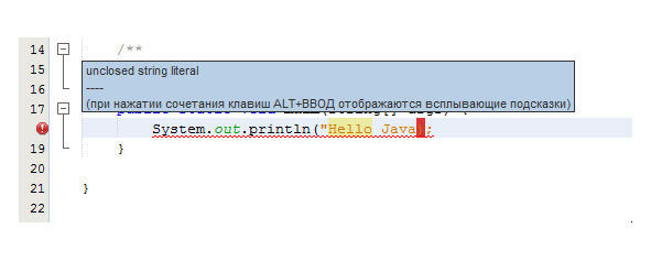Попробуйте совершить ошибку в тексте программы и посмотрите, как отреагирует среда разработки. Удалите одну из кавычек, обрамляющих строку «Hello Java». Система контроля синтаксиса немедленно отреагирует на ошибку. Ближайшая круглая скобка будет выделена красным цветом (из-за отсутствующей кавычки эта скобка оказалась не на своем месте), а напротив строки, содержащей ошибку, появился восклицательный знак на красном фоне. Это обозначение критической ошибки, которая приведет к ошибке компиляции. При наведении указателя мыши на значок ошибки появляется всплывающая подсказка (рис. 2.5).