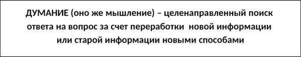 Так и мы с вами. Пока мы не выясним, что такое думание, нам не удастся понять многие важные вещи. Мы, например, так и не сможем решить, чем думание отличается от всем известного пережевывания. Нам останется непонятным, что можно считать эффективным думанием, а что неэффективным. И самое главное: мы не узнаем, как нужно думать, чтобы это было эффективно.
