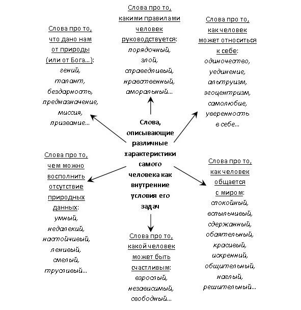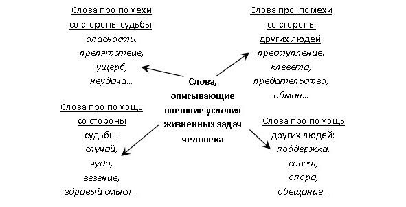 После этого мы с вами поговорим о том, как влияют на нашу жизнь слова, описывающие условия наших жизненных задач. Все соответствующие слова будут разбиты на две группы: слова про характеристики самого человека и слова, описывающие внешние, не зависящие от нас условия наших жизненных задач.