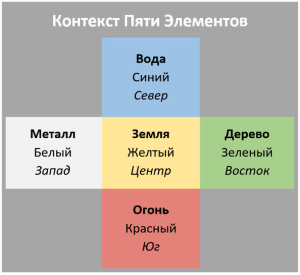 Чаще всего Пять Элементов описывают через метафоры Пяти Стихий, Пяти Цветов и Пяти Направлений (как и было обещано в начале книги, мы не будем здесь рассматривать многочисленные варианты, а ограничимся конкретными примерами).