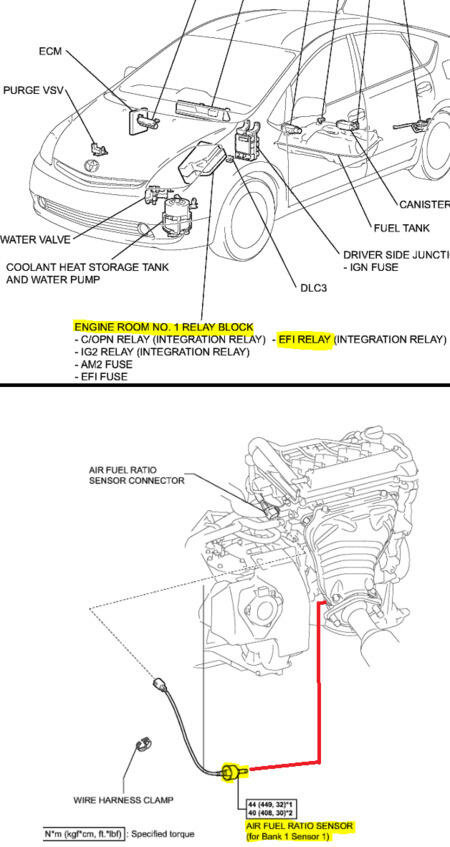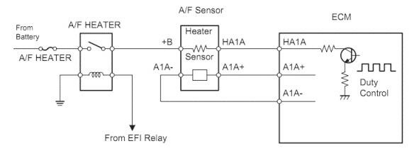 Датчик соотношения воздух-топливо (A / F) должен достичь минимальной рабочей температуры 1200 градусов F для получения точного сигнала напряжения. Чем быстрее датчик соотношения воздух-топливо достигнет этой температуры, тем быстрее датчик начнет посылать точный сигнал на модуль управления двигателем (ECM). Чтобы достичь требуемой температуры, внутри датчика есть нагревательный элемент. Контроллер ЭСУД контролирует элемент нагревателя датчика соотношения воздух-топливо на основе сигналов от температуры охлаждающей жидкости двигателя и нагрузки двигателя. ECM управляет схемой нагревательного элемента. Контроллер ЭСУД контролирует сигнал напряжения, принимаемый через схему элемента нагревателя, и определяет состояние цепи, сравнивая напряжение, обнаруженное с заводскими характеристиками.