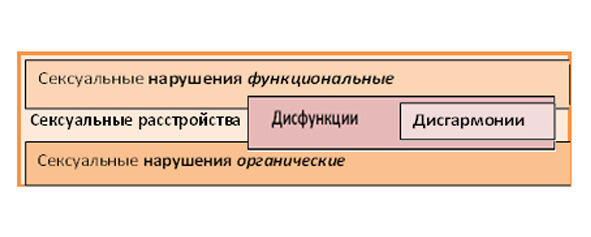 Итак, сексуальные расстройства включают в себя нарушения, дисфункции и дисгармонии. С учетом предложенных определений, картина сексуальных расстройств наглядно выглядит как на рис. 1.