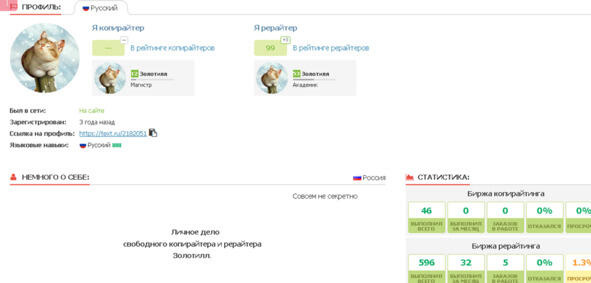 Немного о себе. Я уже три года занимаюсь написанием текстов под заказ и достиг определенных успехов в этой деятельности. На одной из самых удобных, и постоянно обеспеченных заказами бирж, я вхожу в топ-100 рерайтеров.