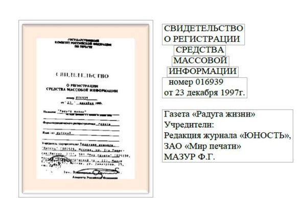 Как видите, газета «Радуга жизни» была зарегистрирована 23.12.1997 года, а до того выходила под названием «Радуга», которая была зарегистрирована в Московском региональном управлении Комитета по печати РФ. Так бы всё и продолжалось, если бы вдруг не раздался звонок из Комитета по печати с неожиданным сообщением: