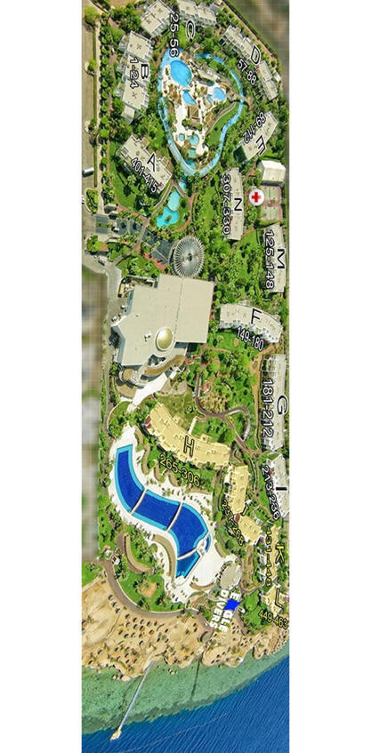 Слева находится отель «Otium Hotel Amphoras» 5*, справа «Sunrise Select Diamond Beach Resort» 5*.
