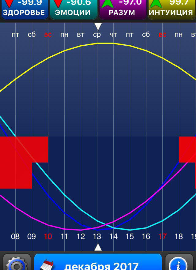 Один из самых интересных моментов данные биоритмов. Додумалась бы я посмотреть на них ДО путешествия наверное никуда бы и не поехала. По крайней мере, именно тогда. Один из самых чёрных дней в году, да еще 13-е Все три биоритма физический, эмоциональный и интеллектуальный в эти дни оказались на минимуме На дне! Одновременно!.. "В такие дни я был с собой в разлуке, и никого помочь мне не просил!.." А тут взяла, и поперлась в Ленинград!