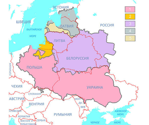 1. Речь Посполитая (Польша-зависимая Украина+Великое княжество Литовское) в границах 1619 года в сравнении с границами современных государств. 1) Королевство Польское (Корона), 2) Герцогство Пруссия вассал Короны, владение Тевтонского Ордена. До того это т.н. госпитальное братство (девиз: Помогать-Защищать-Исцелять), вышедшее из ордена Госпитальеров, переродившееся, едва ли не в свою противоположность, неоднократно атаковало княжество Литовское но, в 1410 г. потерпело сокрушительное поражение в битве под Грюнвальдом от польско-литовских (русских) войск под командованием Ягайло и его двоюродного брата Витовта. 3) Великое княжество Литовское, 4) Задвинское герцогство, кондоминиум Литвы и Короны, 5) Герцогство Курляндия и Семигалия, вассал Литвы, с 1569 года Речи Посполитой.